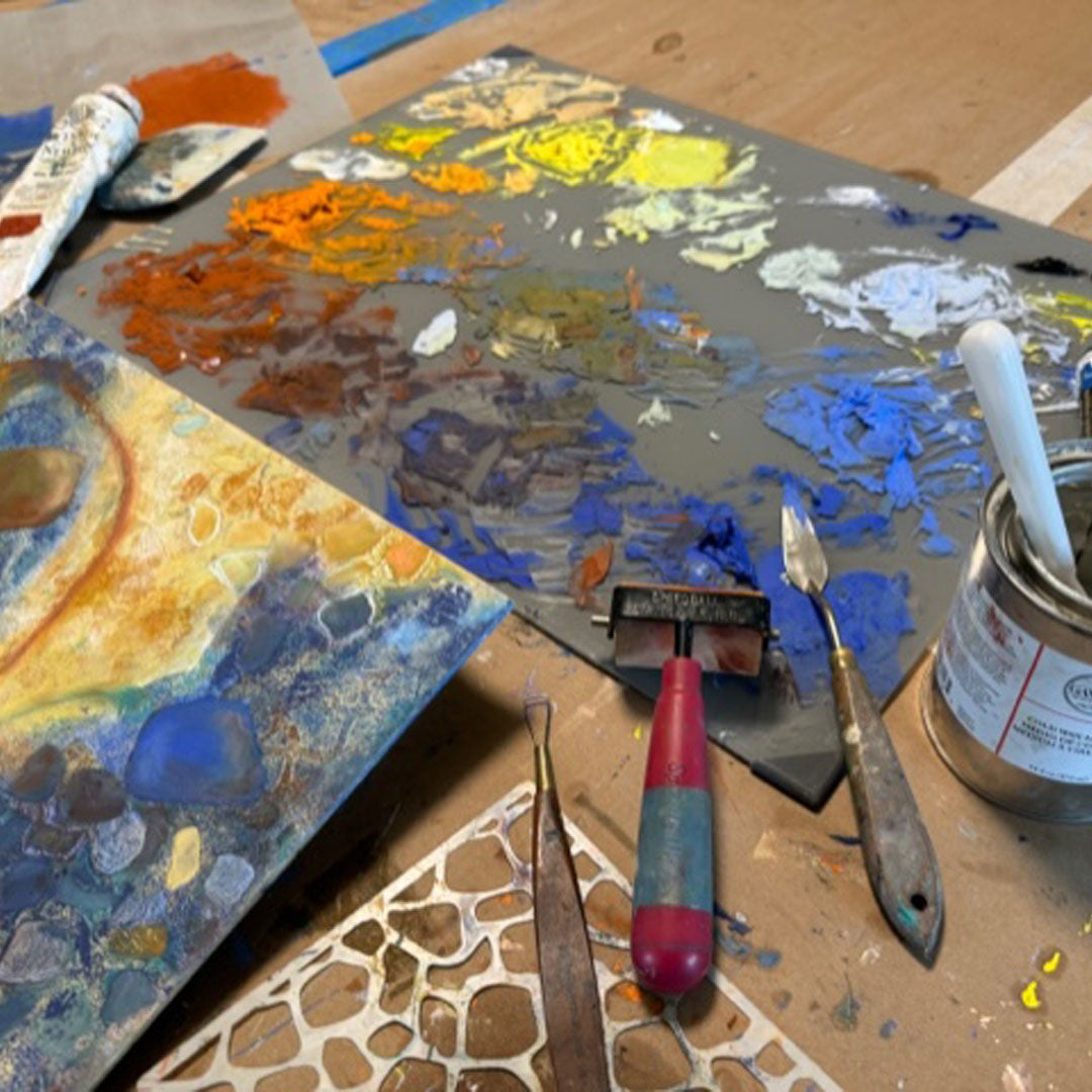 The current first-ever public exhibition of Theresa Kennedy’s artwork, which contains a series of abstract and landscape paintings distributed throughout various locations in Santa Monica, Pasadena, and South Pasadena, began production in January 2024. The exhibition's construction started with cold wax artworks of pure abstractions, followed by landscapes. As Kennedy notes, “The landscapes are mainly experiments with different compositions, often using the rule of thirds as a simple start, and playing with lights and darks; from very contrasting values in Early Skies to an almost monochromatic, high-key piece like Iced Over.”