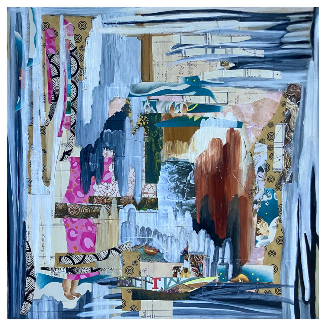 Mixed media on wood panel, incorporating vintage papers, wrinkle-free adhesive, and oil paint on an oak panel.