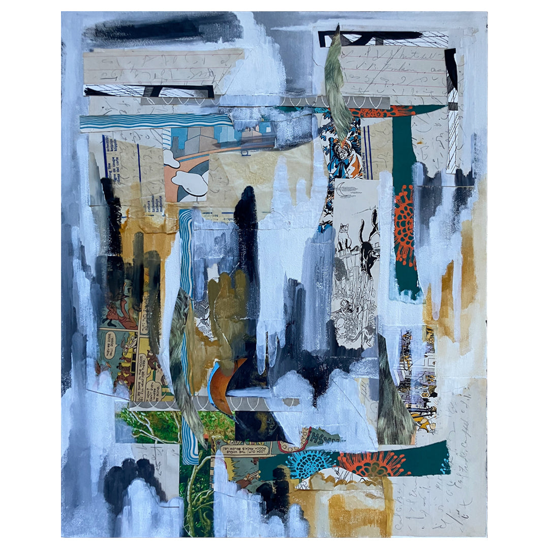 Mixed media on wood panel, incorporating vintage papers, wrinkle-free adhesive, and oil paint on an oak panel.
