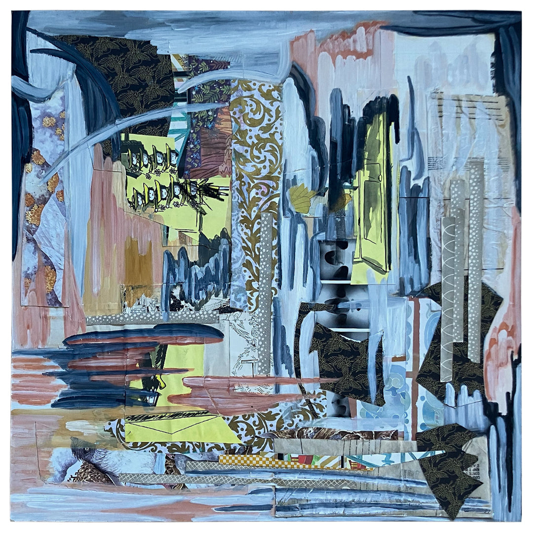 Mixed media on wood panel, incorporating vintage papers, wrinkle-free adhesive, and oil paint on an oak panel.