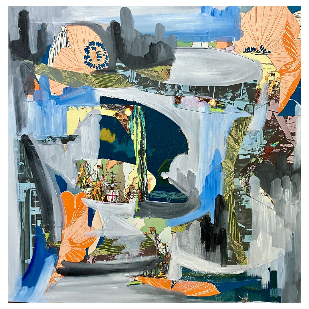 Wrinkle free adhesive, vintage papers, and oil paint on oak wood panel