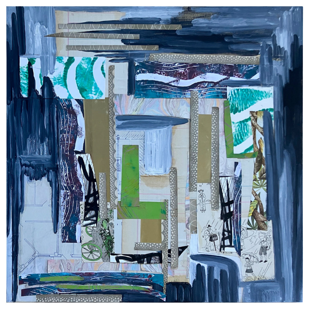 Mixed media on wood panel, incorporating vintage papers, wrinkle-free adhesive, and oil paint on an oak panel.