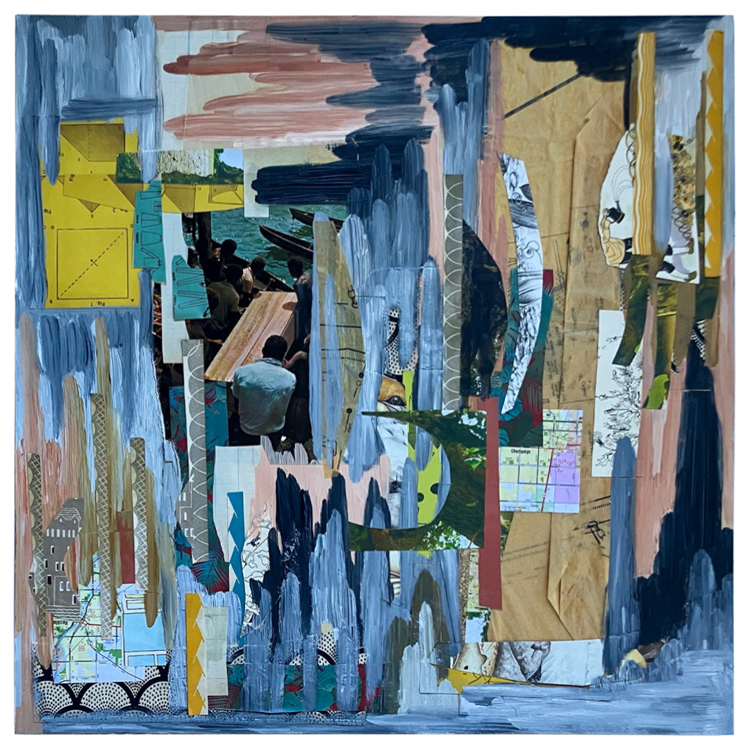 Mixed media on wood panel, incorporating vintage papers, wrinkle-free adhesive, and oil paint on an oak panel.
